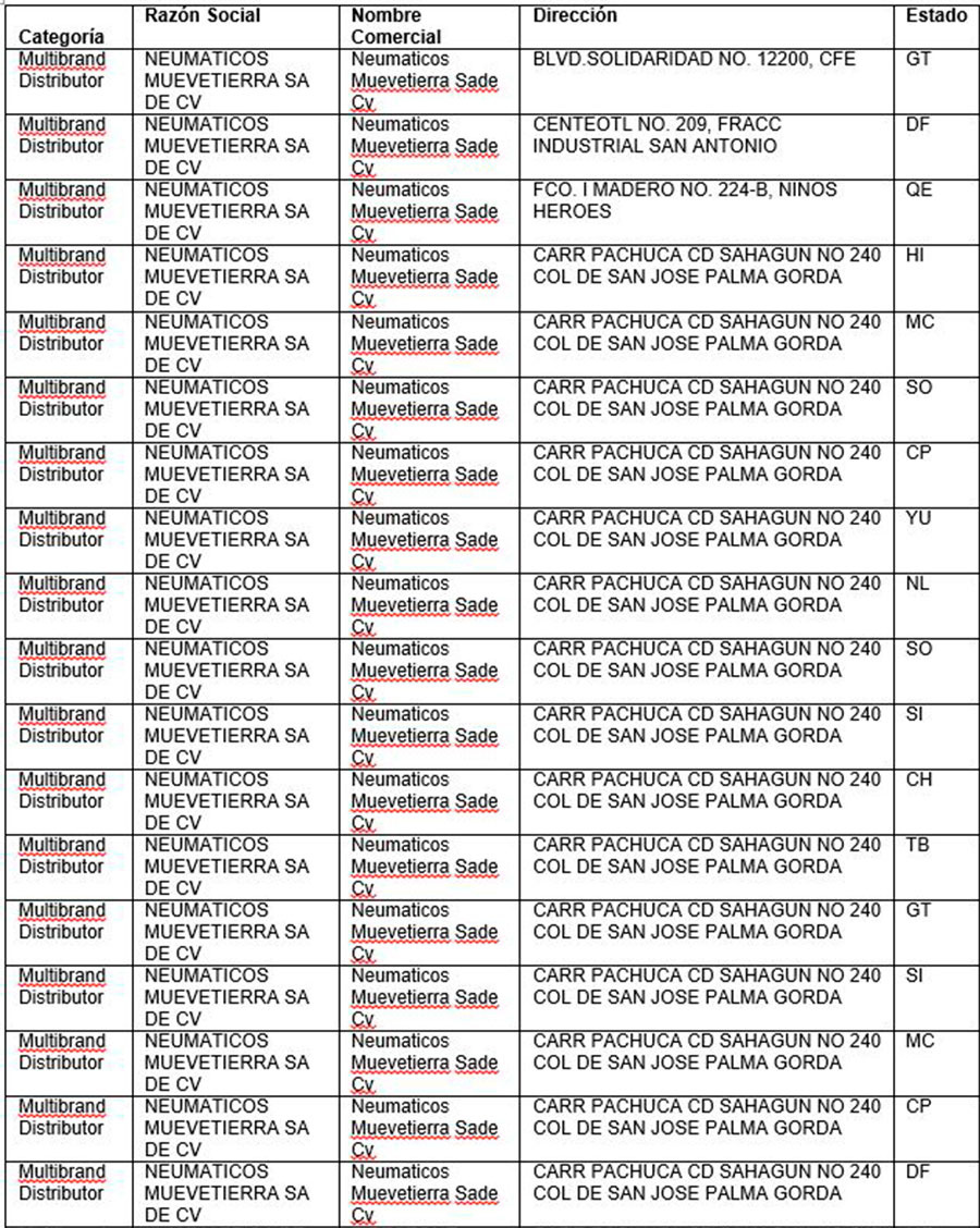 Cobertura: Nivel Nacional (República Mexicana), en los distribuidores exclusivos de la marca MICHELIN®, ver Anexo A.